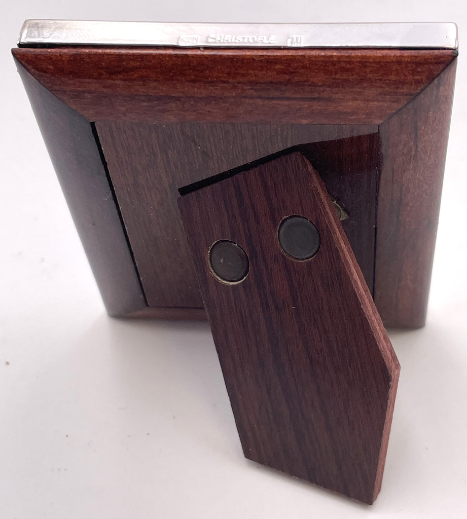 Christofle silverplate French picture frame from the 1970s, in new condition with its original box, with a wood back. It measures 2 3/4'' in height by 2 1/3'' in width by 1/3'' in depth (photo size is 1 2/3'' by 1 1/4''), and bears hallmarks as shown.