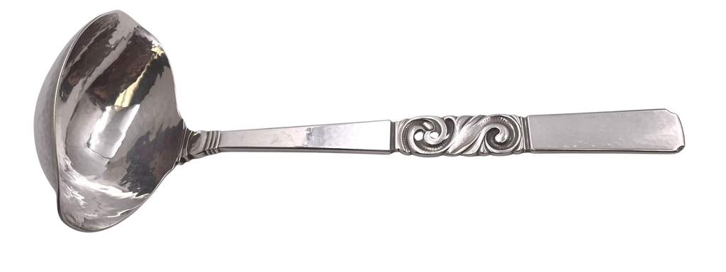 Georg Jensen sterling silver gravy ladle, beautifully hand-hammered, in the celebrated Scroll pattern, with an elegant, geometric design. It measures 7 7/8'' in length, weighs 3.1 troy ounces, and bear hallmarks as shown.