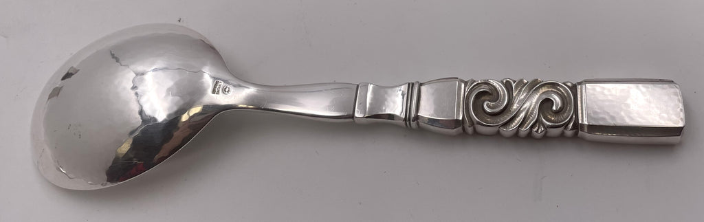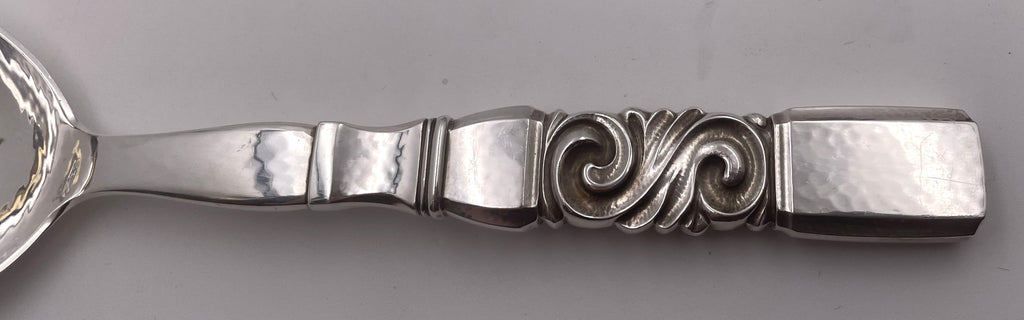 Georg Jensen sterling silver 2-piece salad set (fork and spoon), beautifully hand-hammered, in the celebrated Scroll pattern, with an elegant, geometric design. They measure 8 1/2'' in length, weigh 6 troy ounces, and bear hallmarks as shown.