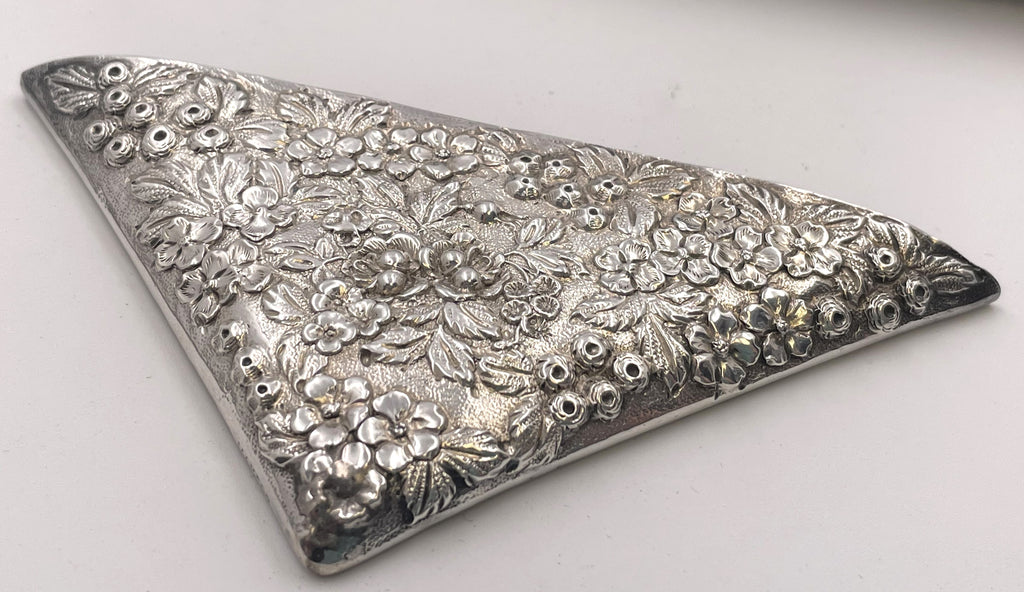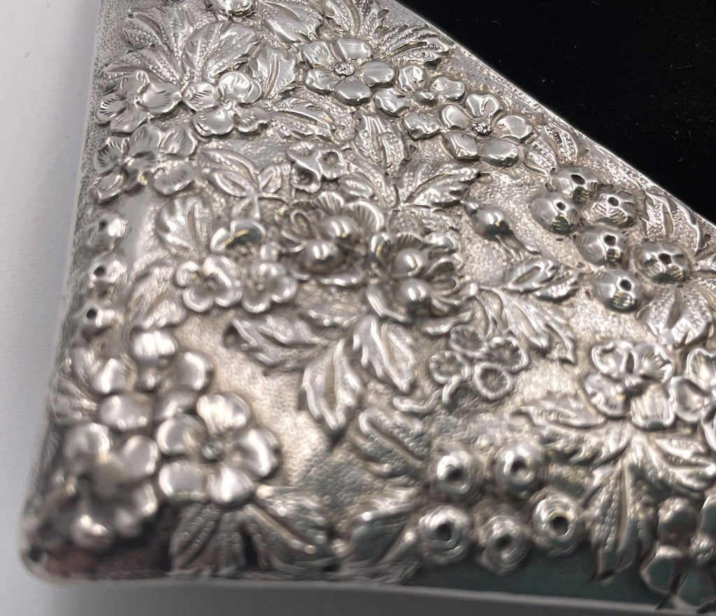Jenkins & Jenkins set of 4 sterling silver blotter corners, made between 1908 and 1915, in exquisite repousse pattern, beautifully adorned with floral and natural motifs. They measure 3 1/3'' by 3 1/3'' by 4 3/4'' from corner to corner and bear hallmarks as shown.