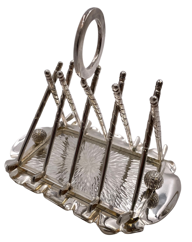 Fine silverplate toast rack, with rare golf theme, the holders shaped as clubs, and showcasing golf ball motifs on either end. This novelty toast rack measures 4 1/3'' in height by 5 1/2'' in depth by 3 2/3'' in width and is in new condition.