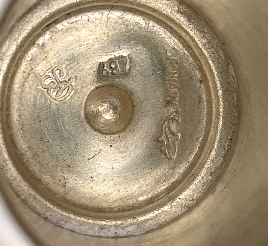 Pair of Danish silver candlesticks, in Mid-Century Modern style, with an elegant, geometric design, the center shaped as spring-like motifs. They measure 6'' in height by 3 3/4'' in diameter at the base. Total weight is 13.2 troy ounces. Hallmarks are shown.