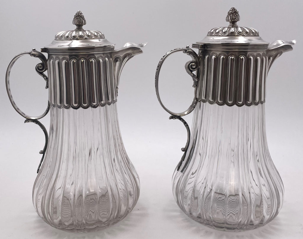 Pair of French 0.950 (higher purity than sterling) silver and cut-glass carafes or pitchers from the late 19th century, with exquisite stylized geometric and natural motifs. They measure 11 1/3'' in height by 7 2/3'' from handle to spout and bear hallmarks as shown.