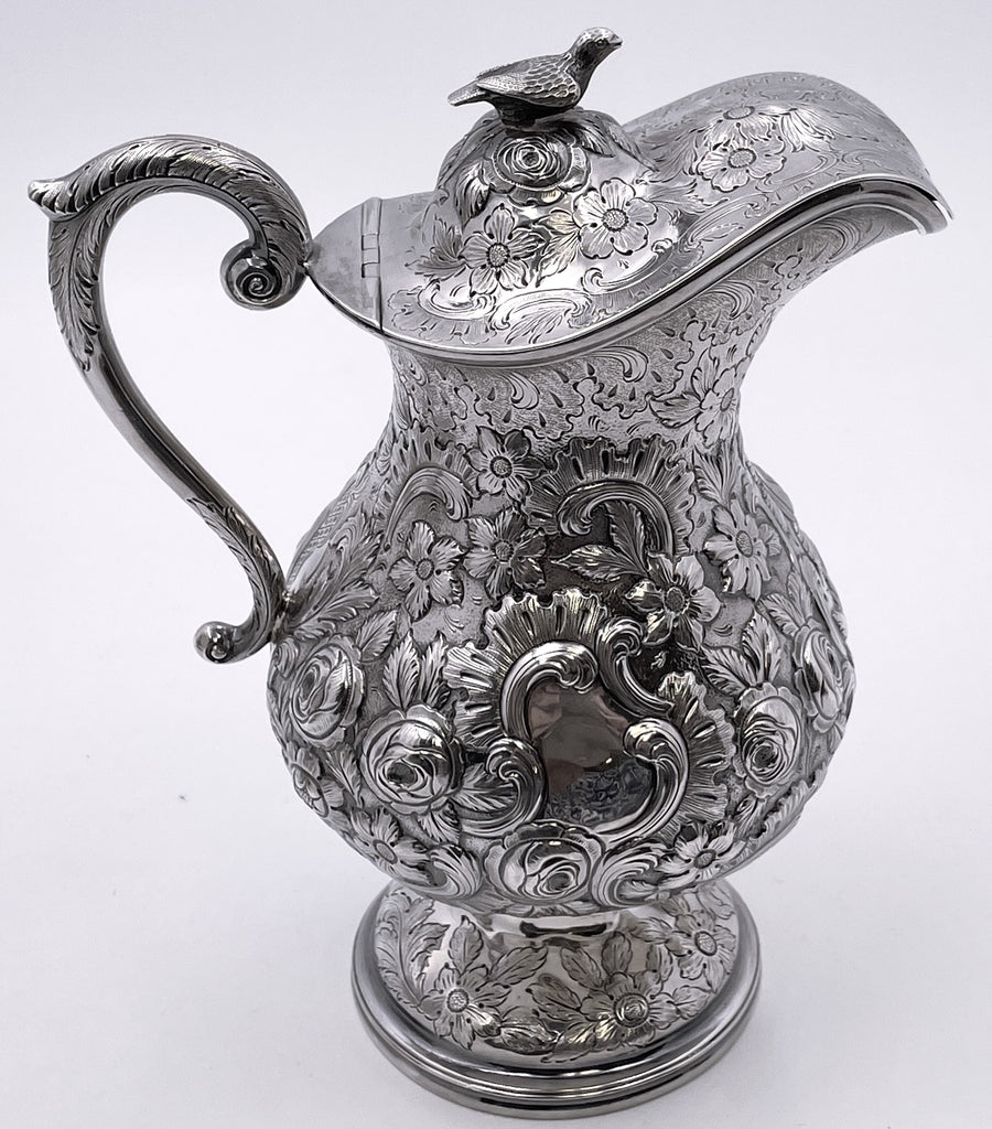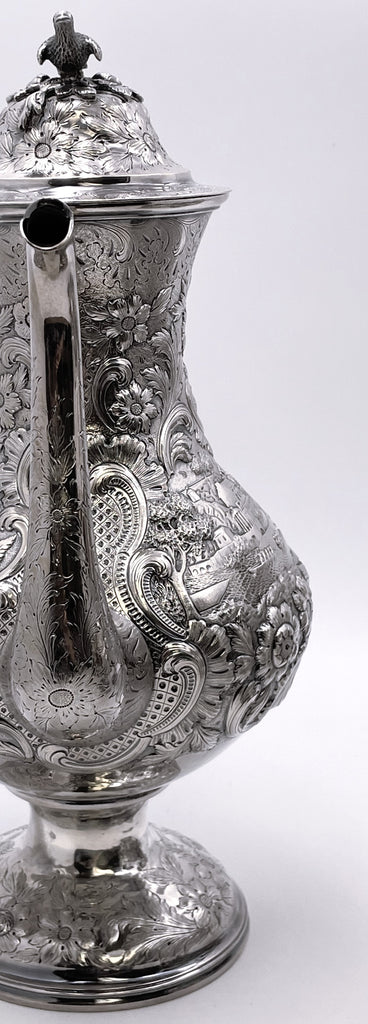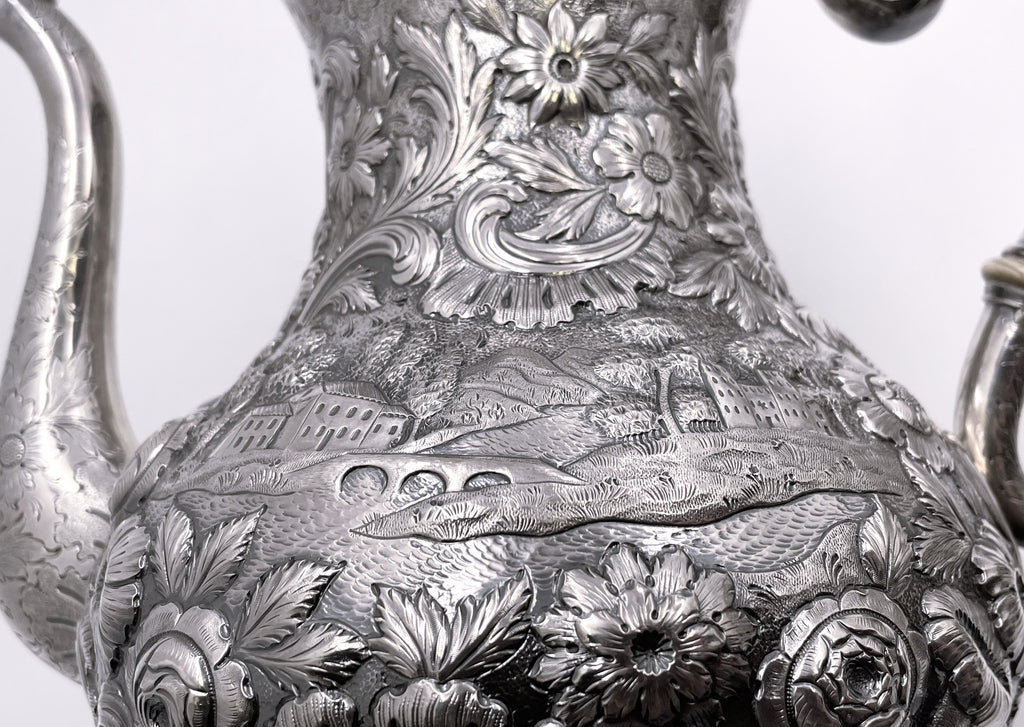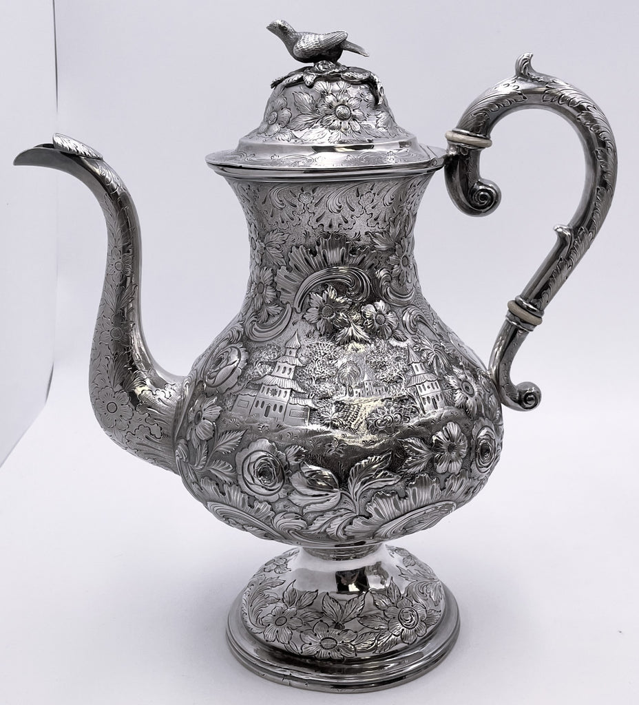 Exceptional Robert and William Wilson coin silver 6-piece tea and coffee set in architectural Castle chinoiserie repousse pattern, with bird finials, all hand-chased, with great details on the raised motifs, from the mid-19th century, consisting of: