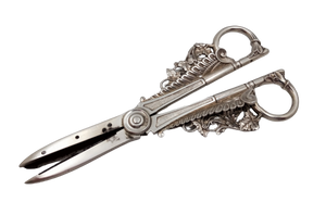 Aesthetic ornate grape shears -- sterling silver by Gorham Silversmiths, circa 1870. Steel reinforcement blades are attached to the sterling blades. Length: 6 1/2"; width, 2 1/2" at handles. Weight: 5.8 troy ounces, approximately.