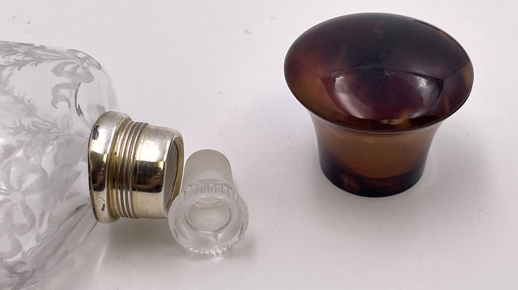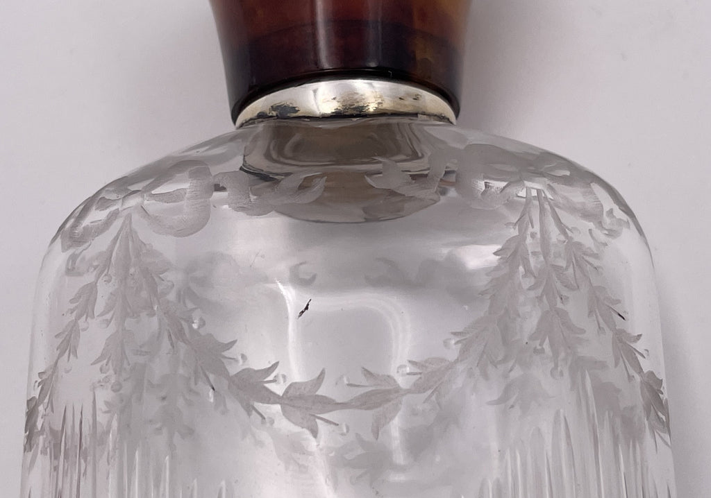 Charles James Fox sterling silver and glass flask, made in London in 1919, with garland and bow motifs. It measures 5 3/4'' in height by 3'' in width by 1'' in depth and bears hallmarks as shown.