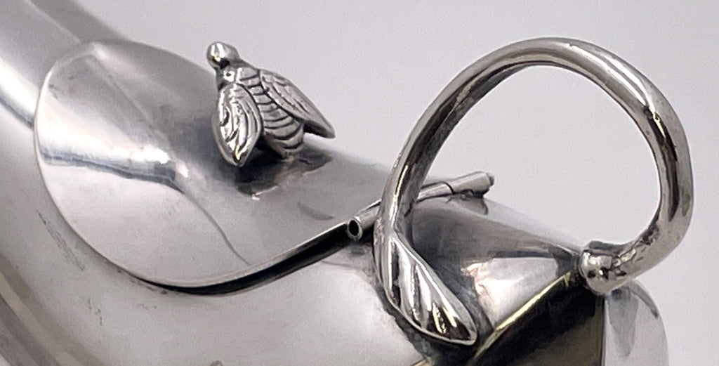 Dutch silver cow creamer from the 20th century, with an applied bee motif adorning the lid. It measures 5 1/3'' in length by 1 3/4'' in depth, weighs 4.7 troy ounces, and bears hallmarks as shown.