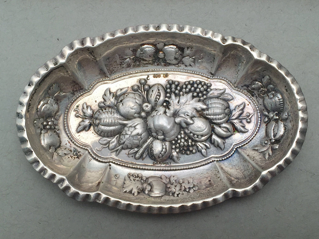 A unique matchbox set with 12 settings for the matchboxes and trays. Designed with a beautiful floral and fruit pattern. Measuring box 20 inches long and 14 1/2 inches wide. Bearing hallmarks as shown in images, German 800 silver.